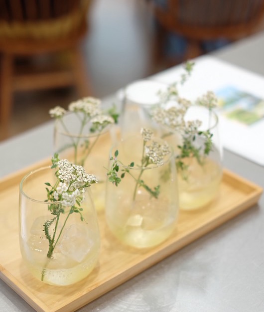 ウェルカムドリンクは、lalafarmtableの奥薗さんが作ってくださった、ミックスハーブのシロップを炭酸で割って。