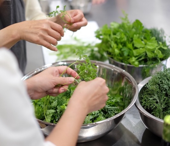 サラダにするため、たくさんのハーブやお野菜を手でちぎっていきます。