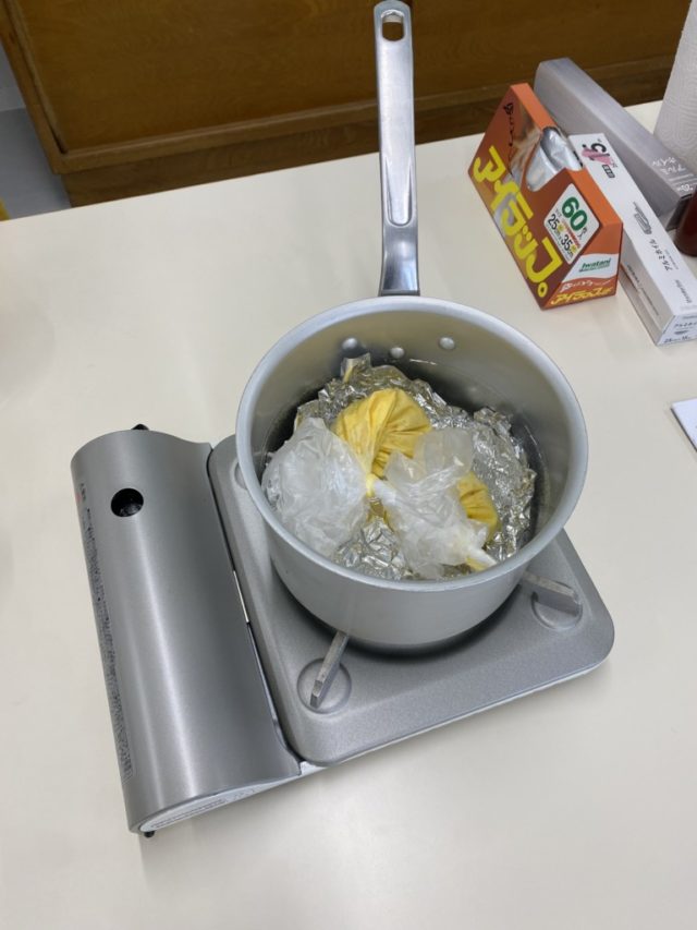 袋に材料を入れてモミモミして、お湯で茹でるだけ。実験のような料理ですが、みんな上手に美味しく出来ました♪