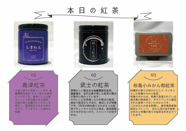 紅茶は仙巌園で販売している、島津紅茶・武士の紅茶・桜島小みかん紅茶をご用意。